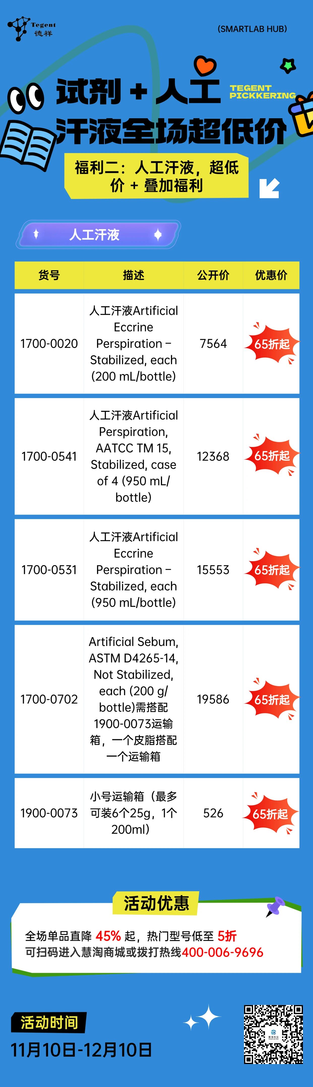 做皮膚測試、化妝品研發(fā)、紡織品實驗,電子元器件及智能穿戴設(shè)備測試,需要貼合真實生理環(huán)境的人工汗液?我們的人工汗液,成分精準(zhǔn)、即開即用,這次價格同樣驚喜: