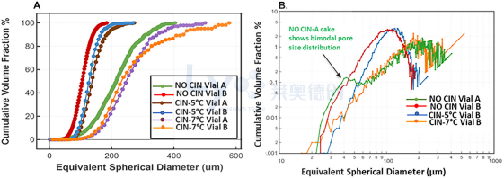 圖7:完整 NOCIN 、CIN-5℃和CIN-7℃產(chǎn)品的模擬氣孔大小分布。(A)正常和(B)對數(shù)-對數(shù)圖