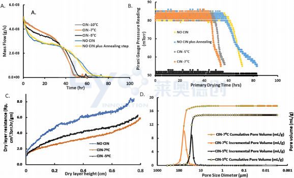 圖2:一次干燥過程 (A)質(zhì)量流量曲線和 (B)差壓讀數(shù)(Pirani和電容壓力讀數(shù))對于 NOCIN、 NOCIN 加退火、CIN-5℃ 、CIN-7℃和CIN-10℃工藝。(C) CIN-7℃ 、CIN-5℃和 NOCIN在一次干燥步驟中干燥層阻力與干燥層厚度關(guān)系圖。(D) CIN-7℃ 、CIN-5℃和 NOCIN 產(chǎn)品的孔體積分布。