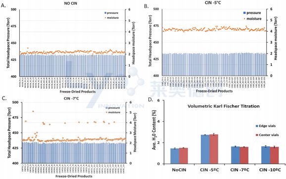 圖4:(A) NO CIN 、(B) CIN-5℃及(C) CIN-7℃產(chǎn)品的部分水蒸氣含量與總頂空壓力;(D) 邊緣與中心小瓶的平均含水量。