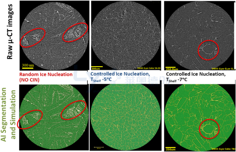 圖6:完整 NOCIN 、CIN-5℃和CIN-7℃產(chǎn)品的高分辨率(2μm)顯微CT圖像(上:原始圖像;下:AI分割圖像) 。 圖像的灰色部分為蛋糕固體壁,而黑色和綠色部分為空氣空隙。圓圈顯示了微觀蛋糕塌陷的片段