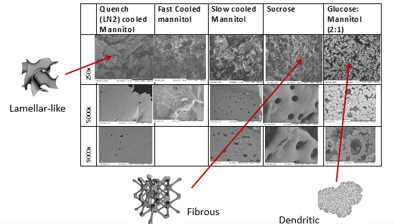 使用掃描電鏡(SEM)對這些樣品進(jìn)行分析,可檢查他們的表面、橫截面和孔隙率,我們可以根據(jù)這些微觀參數(shù)信息對不同的形態(tài)進(jìn)行一個(gè)歸類,如層狀(Lamellar-like)、纖維狀(Fibrous)、樹突狀(Dendritic)等。
