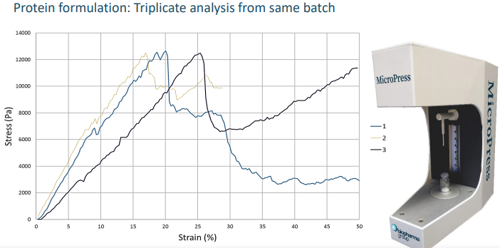 另外,對于凍干輔料對于樣品強(qiáng)度的影響,Micropress也可輕松提供數(shù)據(jù)作為參考。