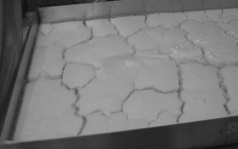通過蔗糖和甘露醇冷凍干燥生產(chǎn)的凍干餅的物理外觀在常規(guī)和控制成核策略之間有所不同。ControLyo®產(chǎn)生了一致的蛋糕結(jié)構(gòu)和外觀。兩種處理方法在甘露醇的外觀上差異不大。然而,蔗糖蛋糕的外觀有顯著差異:未經(jīng)控制的冷凍蛋糕上的裂縫更少,從托盤的一側(cè)延伸到另一側(cè)(圖5)。當(dāng)使用ControLyo®時(shí),蛋糕上的裂縫更寬,更均勻(如圖6所示)。
