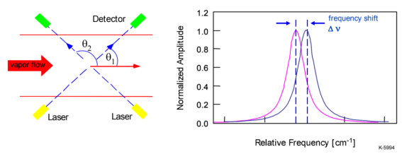 質(zhì)量流量的測(cè)定需要測(cè)量在測(cè)量體積中的氣體流速。速度測(cè)量的概念是基于多普勒頻移吸收測(cè)量, (如圖1所示)。速度是由激光傳播矢量k和已知角度θ引起的水蒸氣的多普勒位移吸收光譜確定的,氣體流速矢量u。吸收光譜相對(duì)于靜態(tài)氣體樣品的吸收波長(zhǎng)在波長(zhǎng)或頻率上移位,其偏移量與氣體的速度u和u與探測(cè)激光束傳播矢量k之間的角度有關(guān)。使用橫跨連通這軸的兩個(gè)視線測(cè)量,用一個(gè)測(cè)量路徑與閥芯內(nèi)的第二個(gè)路徑進(jìn)行比較來測(cè)量頻移,并由方程式(2)來描述: