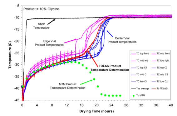 除了TDLAS和熱電偶溫度測(cè)量外,還使用MTM技術(shù)測(cè)定了批次平均產(chǎn)品溫度。MTM和TDLAS技術(shù)在一次干燥是一致的。額外的分析可以確定升華界面的產(chǎn)品溫度Tp [6]。