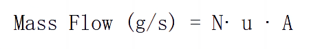 瞬時(shí)質(zhì)量流量(dm/dt,g/s)由方程式(3)確定,dm/dt由測(cè)量數(shù)密度(N,gcm^(-3))、氣體流速(u, cm/s)、通道截面積(A, cm2)和若干單位換算因子的乘積計(jì)算而得:
