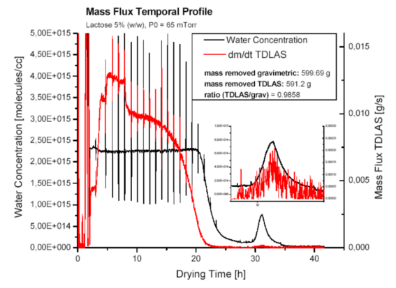 圖3顯示了具有代表性的TDLAS水濃度測(cè)量和質(zhì)量流量測(cè)定,是在Lyostar冷凍干燥機(jī)中干燥5%乳糖配方的過程中進(jìn)行測(cè)定的。