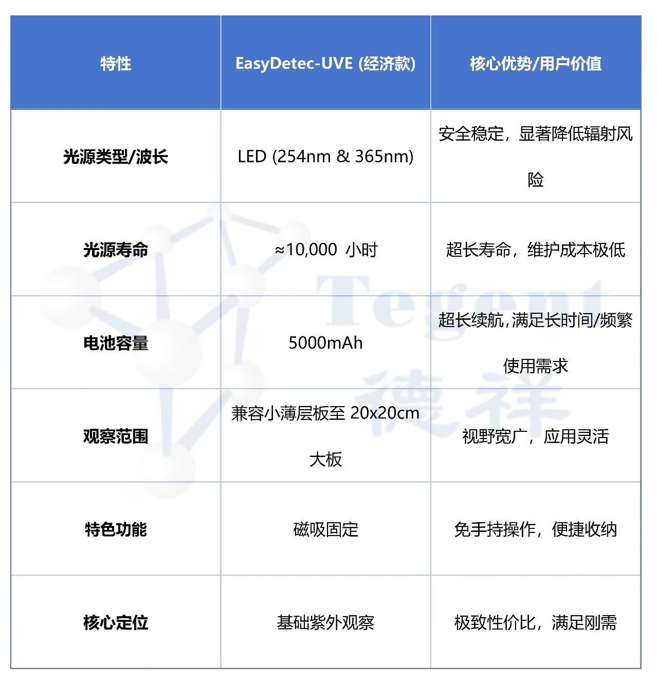 如果你的核心需求是安全、無線、便攜地進(jìn)行紫外觀察,主要使用場景是TLC板(尤其是大板)的常規(guī)觀測,且預(yù)算有限,追求最高性價(jià)比,對磁吸固定和超大電池續(xù)航有特別需求,可選擇選擇經(jīng)濟(jì)款 EasyDetec-UVE。