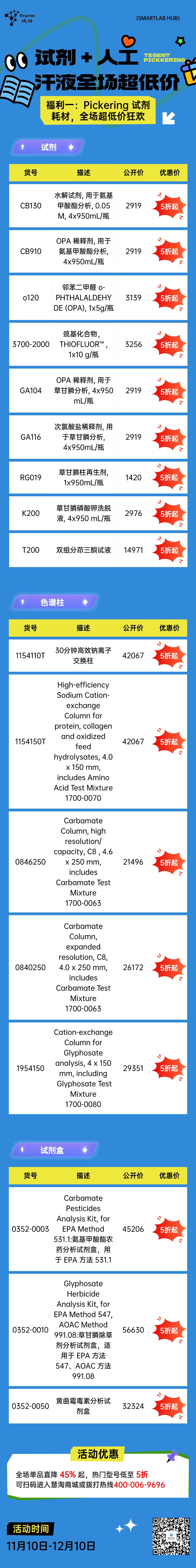 做色譜分析、離子檢測,靠譜試劑是實驗成功的關(guān)鍵!Pickering 全系試劑耗材,從柱后衍生試劑到離子色譜專用耗材,不僅純度在線、適配性強(qiáng),這次價格更是直接 “腰斬” 級優(yōu)惠: