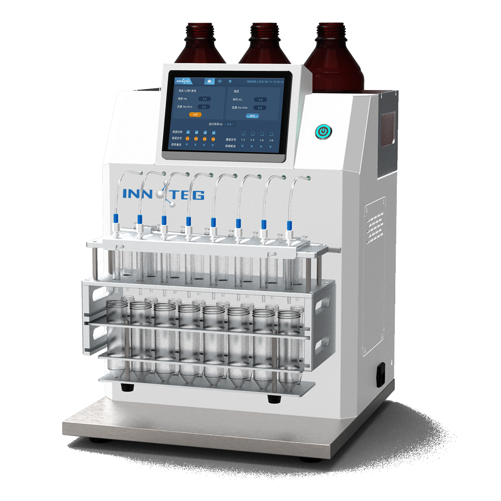 固相萃取(SPE)是色譜分析中最常用的樣品制備方式,需要進(jìn)行活化、上樣、淋洗、洗脫等操作步驟。英諾德EasySPE-E8半自動(dòng)固相萃取儀運(yùn)用精密型蠕動(dòng)泵精確控制過柱的流速,提供穩(wěn)定的過柱壓力。“過柱”過程數(shù)據(jù)化:向儲液器中輸送 樣品、溶劑等各個(gè)操作可通過觸摸屏控制軟件完成。同時(shí)進(jìn)行在大體積進(jìn)樣時(shí),處理環(huán)境中的大體積水樣。具有更好的平行性和重現(xiàn)性、更少的交叉污染以及更高的回收率的特點(diǎn),輕松得到高質(zhì)量和可靠的實(shí)驗(yàn)結(jié)果。